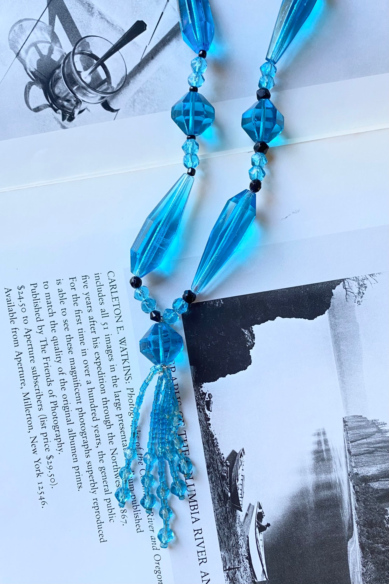 Vibrant sea blue czech glass necklace with contrasting black beads.