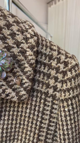 5 button style wool plaid coat from designer Vera Maxwell. Lovely speckled wool in taupes and browns, and some greens and yellows mixed in with the yarn.